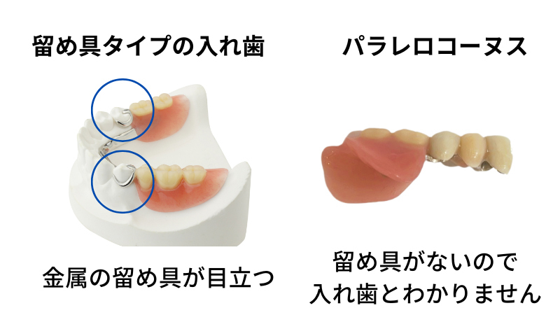 一方、パラレロコーヌスは金属の留め具が目立たない入れ歯治療法。入れ歯をつけた状態で口を開いても、留め具が見えないので、入れ歯をつけていることに気づかれません。